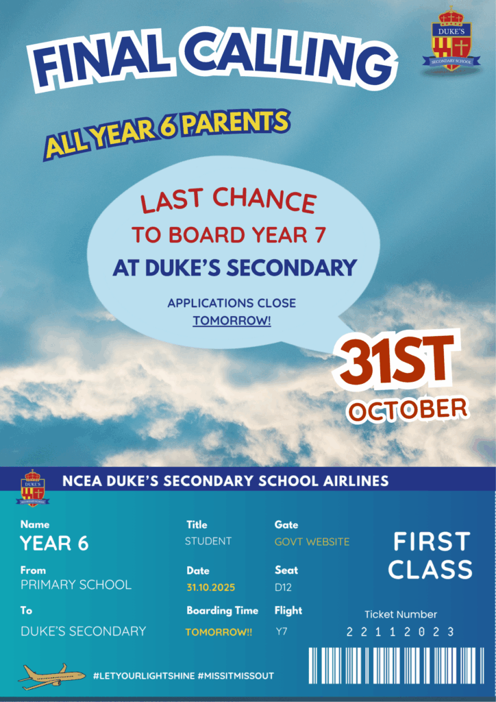 This is your last opportunity to apply for your child’s place into NCEA Duke’s Secondary School.